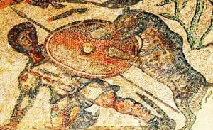 En esos días finales del Imperio se desarrolla este drama de Los últimos de La Olmeda, en un paralelismo que quiero hacer con precisamente esos otros dos grandes dramas que todo el mundo en esa época conocía: la erupción del Vesubio y la legendaria guerra de Troya. Porque la historia de Troya y sus héroes está muy presente en la casa de La Olmeda, siendo el motivo principal del mosaico del salón VIP nada menos que la historia de Aquiles en el Palacio de la Isla de Skiros. Para mí una de las más bellas imágenes de todo el arte de todo el Imperio Romano y que demuestra, una vez más, la habilidad y buen gusto de los artesanos y artistas castellanos de toda la vida.