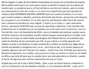Cuesta, famoso por no cortarse a la hora de mostrar su opinión sobre todo tipo de asuntos, ha continuado su escrito afirmando que «unos tendrán más preferencia por la republicana, por la estelada, por la de León o por la asturiana… pero al final del día, hoy, esa es la bandera que veremos cuando suene el himno nacional, era la bandera cuando nuestro equipo nacional ganó el mundial, es la bandera con la que se cubre Nadal cuando gana otro Roland Garros, es la bandera que cubría los féretros de los asesinados por ETA, la que cubrió a mi primo guardia civil Ulpiano cuando le arrebataron la vida cumpliendo su deber». El presentador de DMAX ha sido contundente en su crítica a Dani Mateo a sabiendas de que sus palabras en las redes sociales suelen gozar de gran impacto mediático: