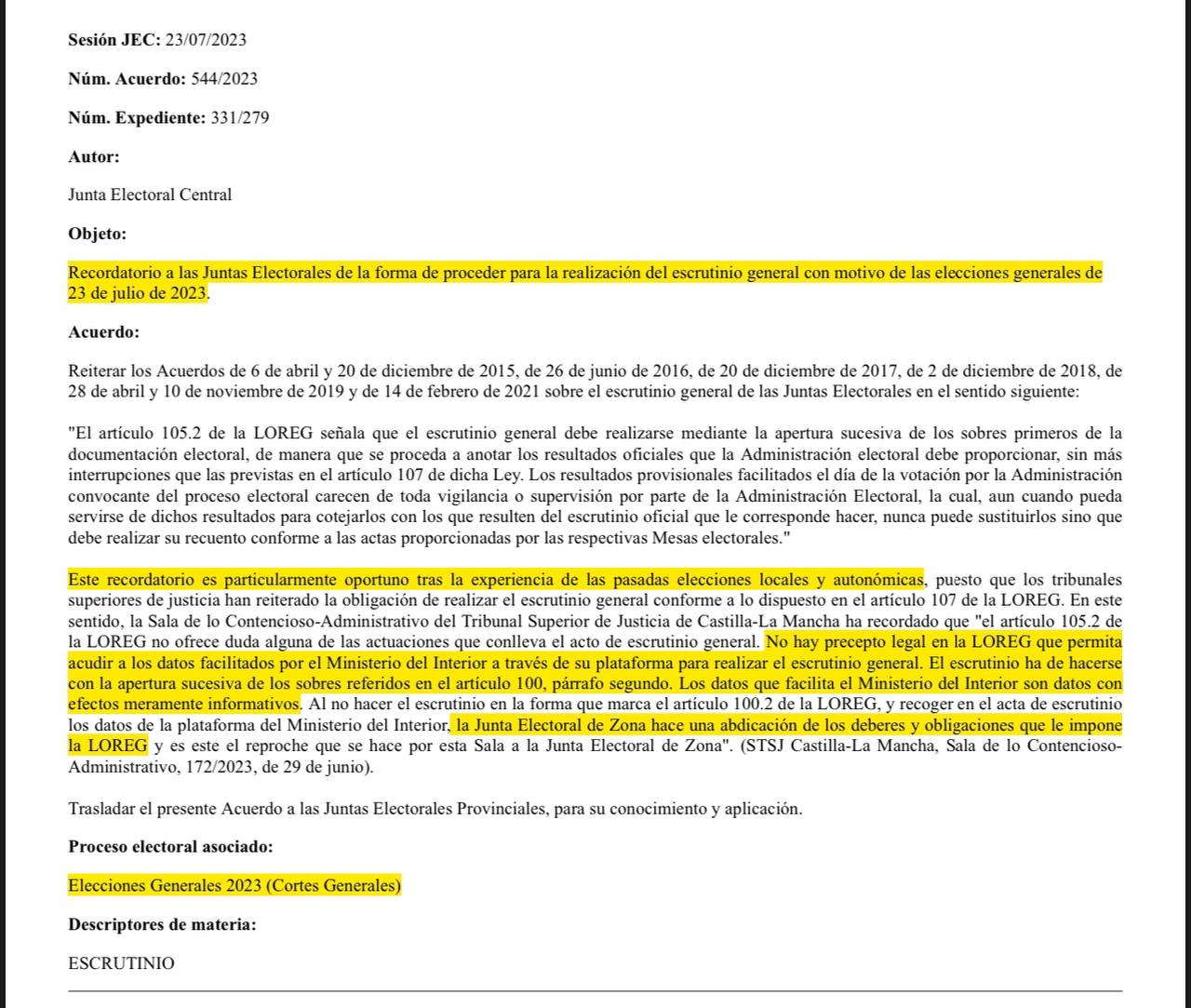 Imprime este acuerdo de la JEC o llévalo en el móvil y si ves que dan inicio al escrutinio general y no suman ni un acta, les enseñas este acuerdo.