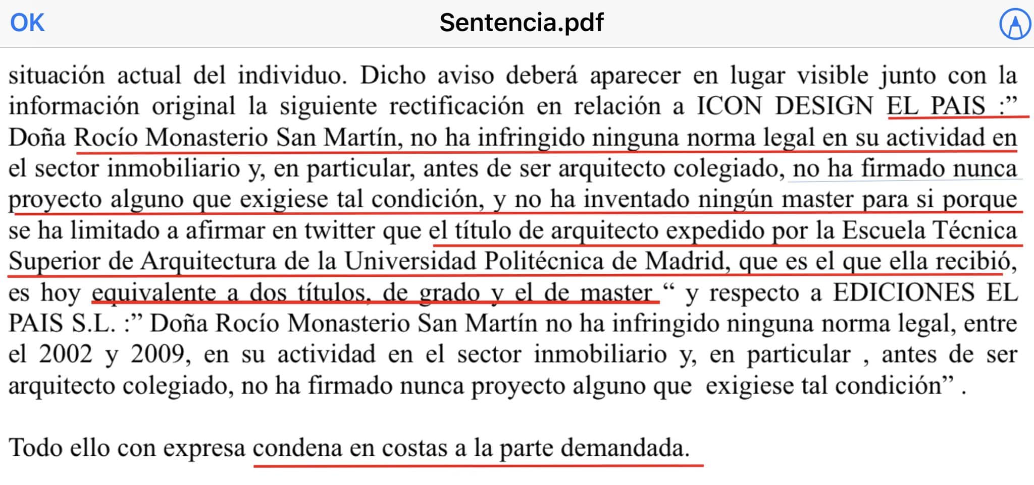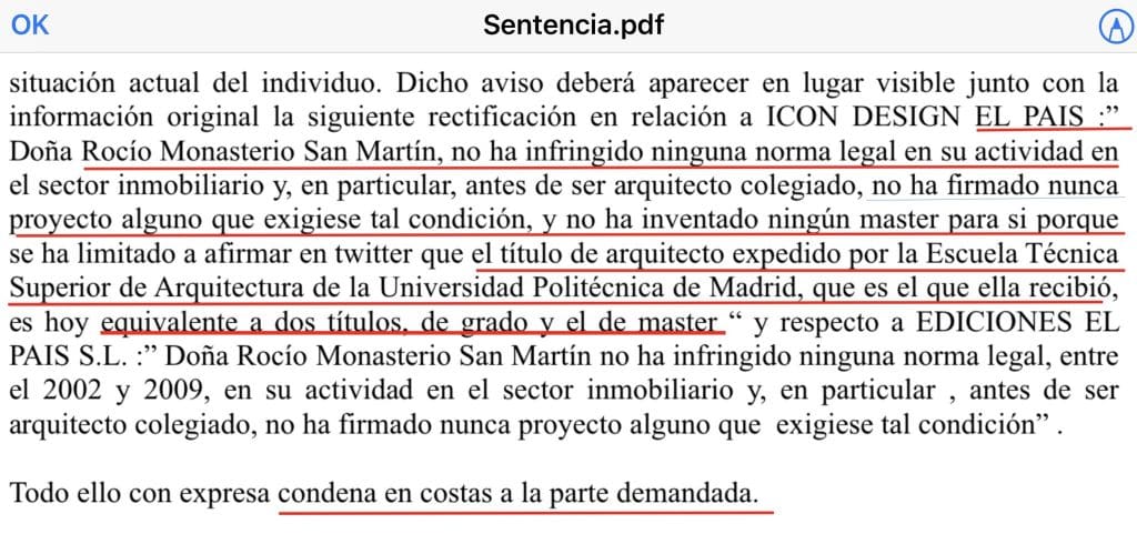 Esta sentencia viene a decir, básicamente, que lo dicho por ‘Lo País’ es falso, que Monasterio nunca había cometido ninguna irregularidad y condena a estos “vendebulos” a publicar una rectificación en un lugar visible junto con la publicación original, además de ser condenados en costas.