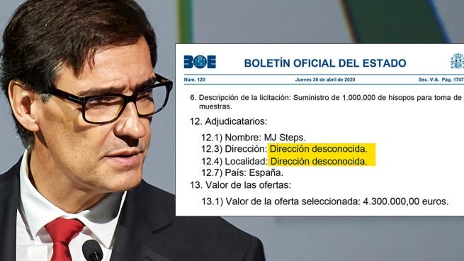 En el BOE del día 30 de abril se adjudica una compra de 4,3 millones de euros (5,3 millones de euros con IVA) a una empresa denominada MJ Steps, por el procedimiento de urgencia, lo cual supone que se evitan controles y todo tipo de ofertas en la adjudicación a dedo. Esta adjudicación es por la compra de 5 millones de hisopos (bastoncillos para los test rápidos), la empresa que inicialmente no tenía domicilio conocido, posteriormente dio una dirección falsa en Sant Boi de Llobregat. Esta empresa se dedica a la importación de textil y calzados desde China.