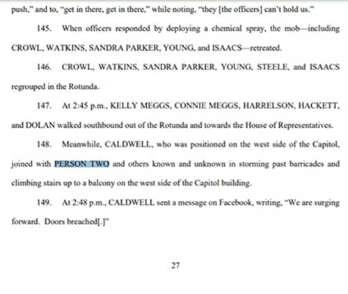 Según una presentación del Departamento de Justicia contra Caldwell, sus presuntos co-conspiradores, el jubilado se unió a la «Persona Dos y otras personas conocidas y desconocidas para asaltar barricadas y subir escaleras hasta un balcón en el lado oeste del edificio del Capitolio».