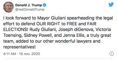 El abogado personal de Donald Trump y ex alcalde de Nueva York, Rudy Giuliani, ha mencionado varias modalidades diferentes de fraude en la elección presidencial: fraudes en la inscripción de los electores, fraudes con los sufragios enviados por correspondencia, fraudes en el conteo automatizado de las boletas y fraudes cometidos en el momento de la transmisión de los resultados de las máquinas. Es ahí donde intervendría el programa informático de Dominion, contando menos votos para Donald Trump y más para Joe Biden según la cantidad de votos emitidos. El software de Dominion habría sido utilizado para “arreglar” los resultados de las elecciones en varios países, incluyendo Venezuela.
