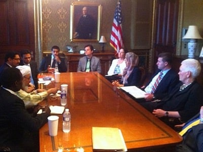 Reunión del Consejo de Seguridad Nacional en la Casa Blanca, el 13 de junio de 2013, o sea bajo la administración Obama. El personaje con turbante blanco y gafas, sentado del lado izquierdo de la mesa, es el jeque Abdallah ben Bayyah, segundo del dirigente de la Hermandad Musulmana, Yussef al-Qaradawi.