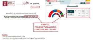 ¿Qué magnitud ha tenido esta purga? De acuerdo a las cifras dadas por el Ministerio del Interior y el INE, el 7 de marzo de 2019 el censo total era de 36.893.976 votantes, pero el 28-A los votantes totales fueron 26.361.051 –incluyendo votos en blanco y votos nulos–, y si a esta cifra le sumamos una abstención de 8.437.153, el resultado final nos da 34.798.204, con lo cual se demuestra que han sido purgados del censo 2.095.772 votantes.
