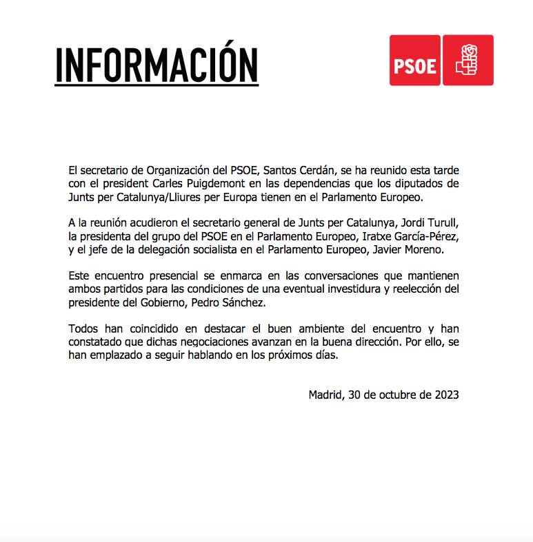 Una imagen con la que el PSOE ha querido publicitar la interlocución con el ex presidente catalán fugado de la Justicia, cuyo interlocutor ha sido el «designado» por el PSOE, Santos Cerdán. Al encuentro han acudido además, el secretario general de Junts per Catalunya, Jordi Turull, la presidenta del grupo del PSOE en el Parlamento Europeo, Iratxe García-Pérez, y el jefe de la delegación socialista en el Parlamento Europeo, Javier Moreno.