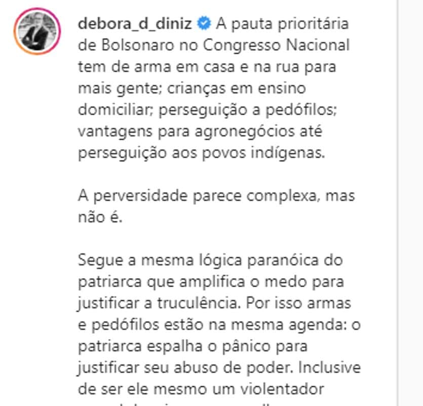 Este jueves, la activista pro-aborto brasileña, Debora Diniz, le exigió al presidente Jair Bolsonaro detener la persecución contra los pedófilos, luego de que el mandatario presentara una lista de medidas prioritarias para el Gobierno Federal ante el Congreso, entre las cuales, estaba endurecer las penas contra los condenados de pedofilia.