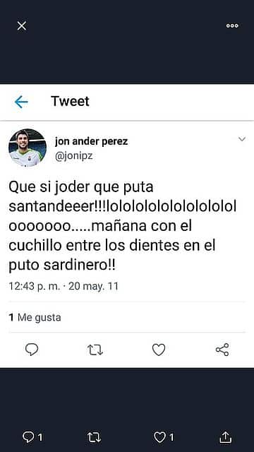 Nada más aterrizar nuestro delantero, Jon Ander Pérez (representado por Egoitz Basurto), veo en sus redes sociales cómo anteriormente hizo comentarios de “Puta Santander y puta España”. Todo ello acompañado de una foto en la que se le podía ver acompañado de sus amigos, nada menos que con una pancarta proetarra de acercamiento de presos.