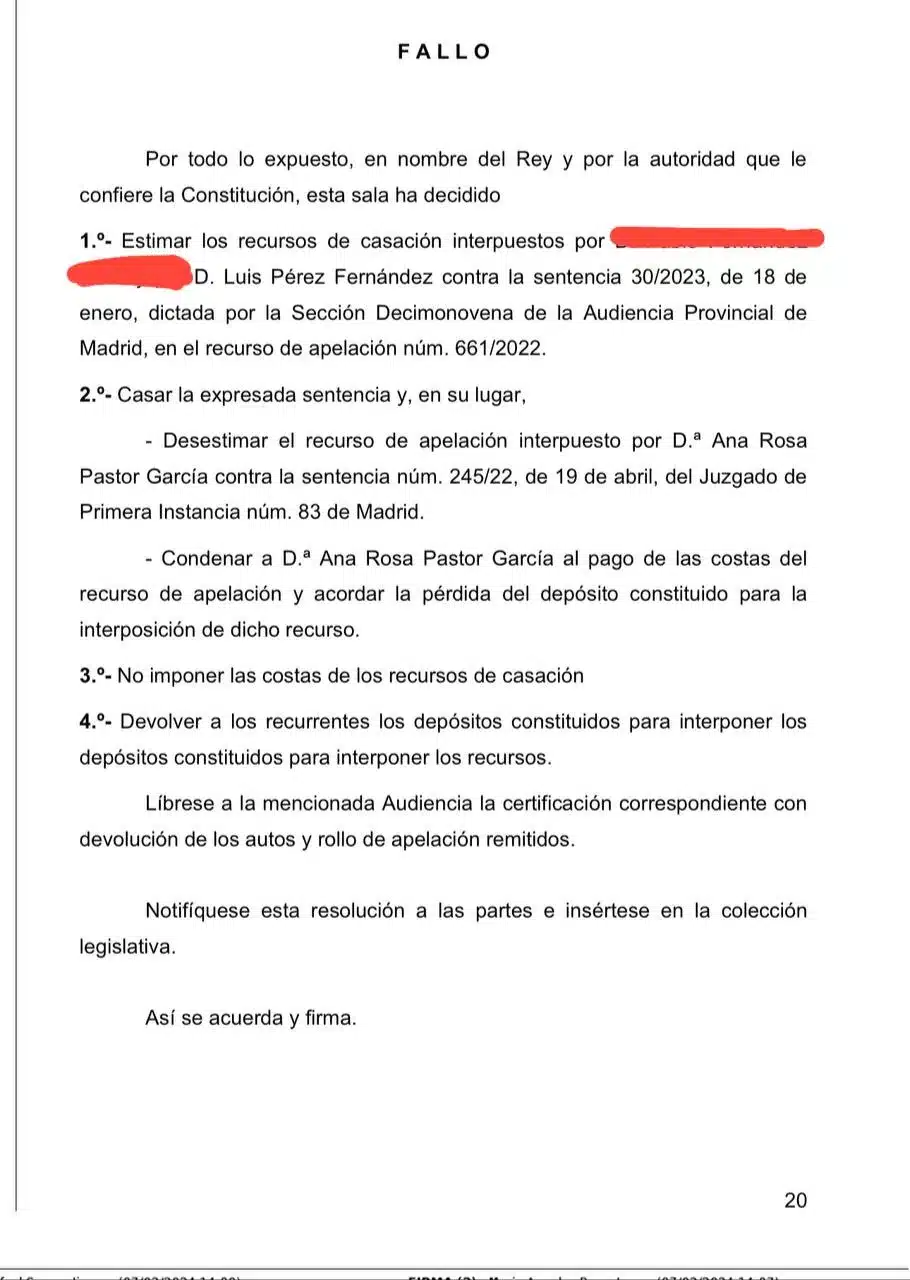 La sentencia núm. 165/2024 del Tribunal Supremo ha resuelto de manera íntegra a favor de Pérez, representado por el letrado D. José Luis Mazón, culminando así un proceso legal que lleva años capturando la atención de medios y público por igual. El fallo judicial desestima completamente el recurso de apelación interpuesto por Pastor, afianzando la decisión previamente tomada por el Juzgado de Primera Instancia núm. 83 de Madrid, bajo la sentencia núm. 245/22 de 19 de abril.