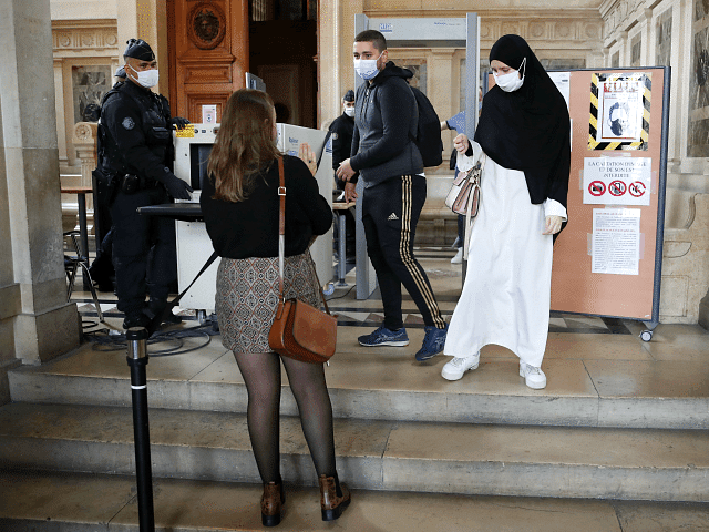 En esta fotografía de archivo del 5 de octubre de 2020, se observa a personas antes del juicio de Sidi Ahmed Ghlam, un argelino de 29 años acusado de matar a una mujer e intentar volar una iglesia cerca de París. (Foto AP / Francois Mori, archivo)