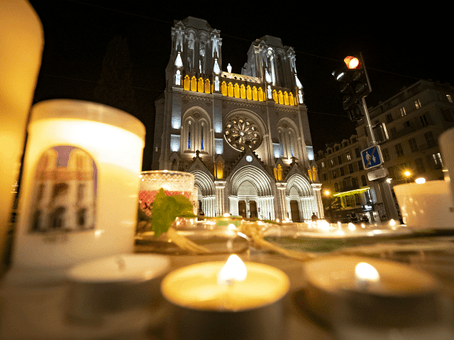La gente rinde homenaje por la noche frente a la Basílica de Notre Dame el 29 de octubre de 2020 en Niza, Francia. Un hombre armado con un cuchillo atacó fatalmente a personas en la iglesia, ubicada en el corazón de la ciudad. (Arnold Jerocki / Getty Images)