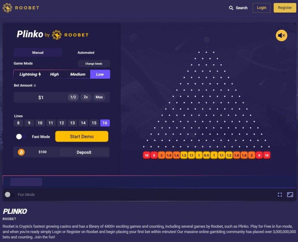 Jugar al Plinko en el casino RooBET es sumamente sencillo. Primeramente, asegúrate de tener una cuenta en RooBET y de haber depositado tus criptomonedas. Una vez listo, dirígete a la sección de juegos y selecciona la opción Plinko. Aquí es donde comienza la verdadera diversión.