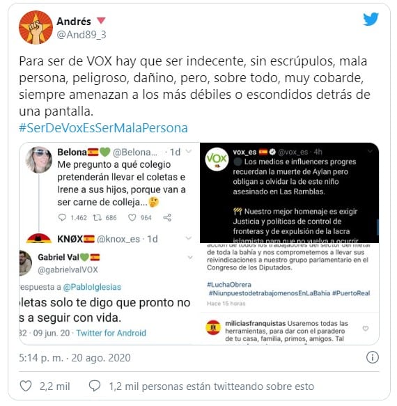 VOX ensalza lo peor del ser humano.— ღPrincesa Pálida 👗☭ 💄👠 (@Princesa_Palida) August 20, 2020