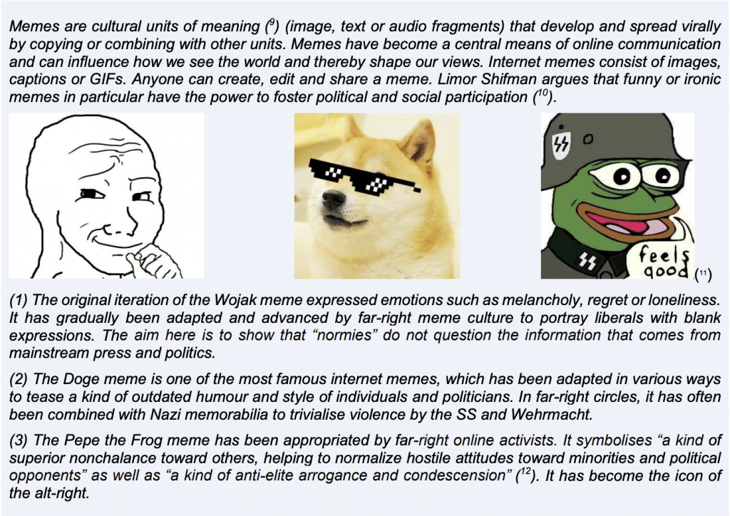 Una parte importante del documento está destinada a analizar los memes de la derecha y cómo supuestamente son indicativos de racismo. Según la Unión Europea, la extrema derecha “invirtió mucho tiempo y energía en la producción de memes” para “difundir su ideología“, a pesar de que el humor en Internet es algo orgánico no-centralizado.
