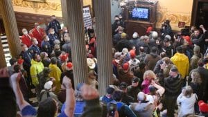 Al grito de “déjennos entrar”, los manifestantes, algunos con parafernalia del presidente Donald Trump, irrumpieron en el interior del edificio, lo que obligó a un grupo de policías a resguardar la entrada del recinto donde debatían los legisladores locales.