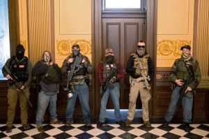 - A militia group with no political affiliation from Michigan stands in front of the Governors office after protesters occupied the state capitol building during a vote to approve the extension of Governor Gretchen Whitmer’s emergency declaration/stay-at-home order due to the coronavirus disease (COVID-19) outbreak, at the state capitol in Lansing, Michigan, U.S.