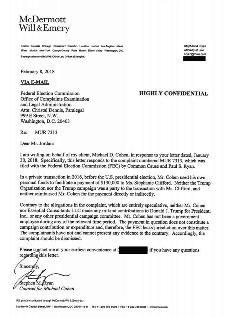 Finalizando con el contenido del documento, en representación de Michael Cohen, su abogado, Stephen Ryan, expresó que Cohen no efectuó de ninguna manera contribuciones a la campaña presidencial de Donald Trump, o ninguna campaña política, resaltando que el papel de la Comisión de Elecciones (FEC) no tiene lugar en la investigación, ya que nada tiene que ver con asuntos electorales.