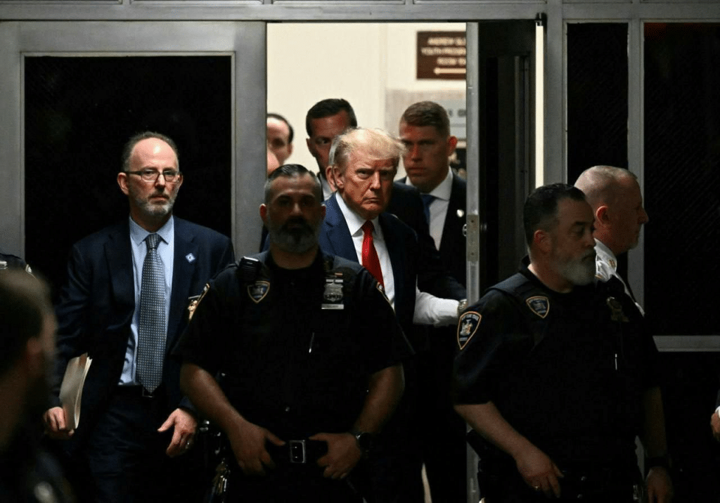 El expresidente entró en la sala del juzgado con un claro gesto de enojo y por su propia voluntad, por lo que no se le colocaron esposas. Vestido con su característico traje azul y corbata roja, estuvo precedido de su equipo de abogados, con Joe Tacopina a la cabeza, y seguido por dos agentes de policía. Inmediatamente después conoció los cargos de la imputación, que lleva el número 71543-23.
