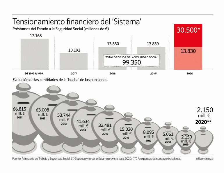 Pagar la nómina de pensiones se ha convertido este año en un ejercicio de equilibrismo que permita mantener los mínimos soportes que aún sostienen las maltrechas finanzas de la Seguridad Social, que además en 2020 tendrá que hacer frente al pago de las ayudas aprobadas durante estas semanas de confinamiento para mitigar los efectos de la crisis sanitaria en la economía del país. La AIReF sitúa el déficit en el 5% para todo 2020 en el mejor escenario. Se estima un déficit del sistema de la Seguridad Social del 3,4%, dejando el déficit del SEPE en un 1,5%, ya que el SEPE es el que se encarga de las cotizaciones de desempleados. De este modo, el Gobierno se verá empujado a pedir ayuda a la Unión Europea para poder pagar las pensiones en los próximos meses y en 2021. El desbordamiento del déficit de la Seguridad Social en torno a los 60.000 millones de euros y la caída de las cotizaciones hace que la capacidad financiera del Sistema sea nula sin contribuciones del exterior. Unas inyecciones extra que, tras los dos préstamos concedidos por el Estado con este motivo supone una acumulación de deuda de la Seguridad Social de 99.350 millones de euros.