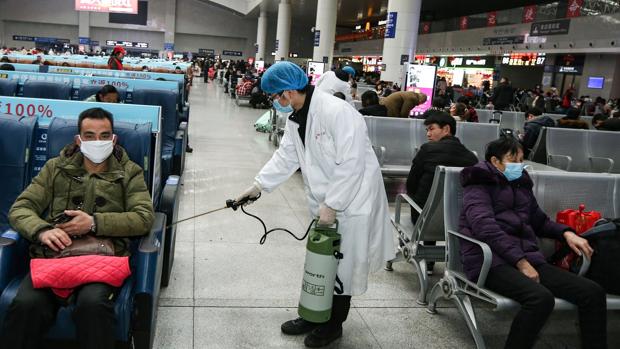 Un operario desinfecta una zona de espera para pasajeros en la estación de tren de Nanchang, en la provincia china de Jiangxi
