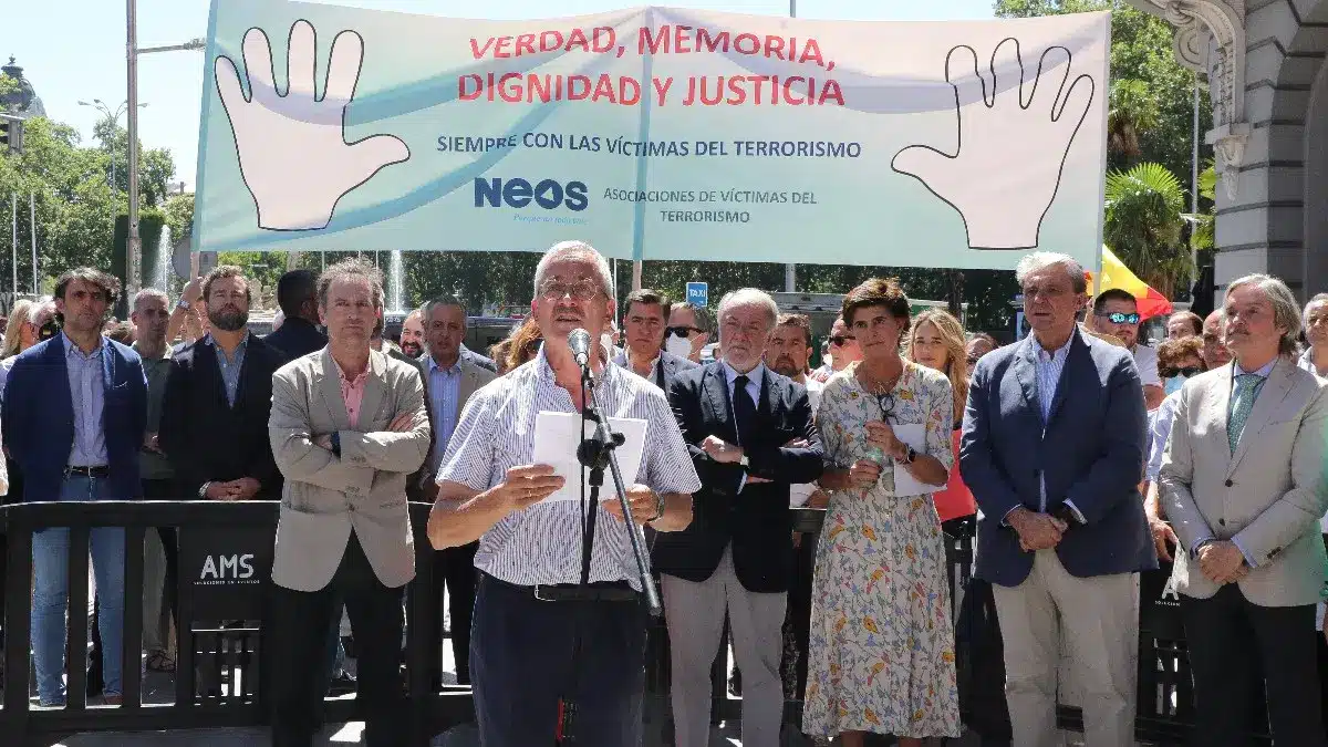 José Antonio Ortega Lara, fundador de VOX y secuestrado durante 532 días por la banda terrorista ETA, y la vicepresidenta de la Fundación Villacisneros y miembro de NEOS, María San Gil, han denunciado la nueva ley de «memoria democrática» dictada por Bildu, en la concentración en la Plaza de las Cortes de Madrid, frente al Congreso de los Diputados, por el 25 aniversario del asesinato de Miguel Ángel Blanco a manos de la banda terrorista ETA.