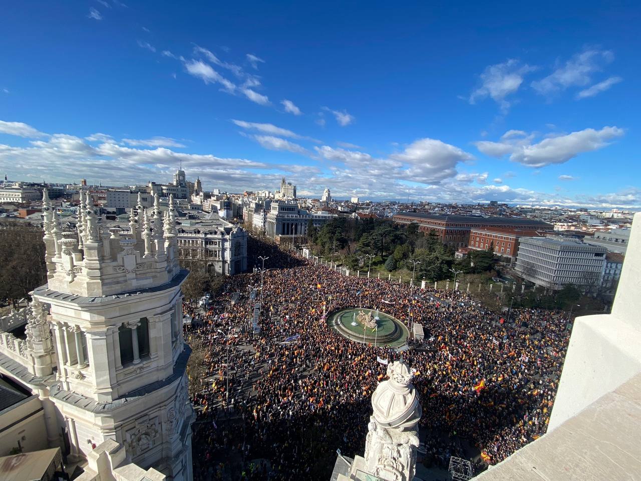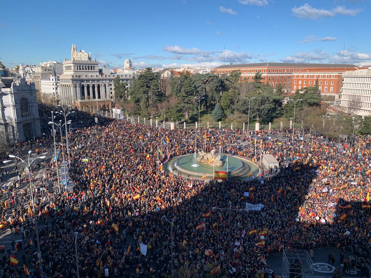 Una multitudinaria manifestación convocada por más de un centenar de asociaciones y colectivos de la sociedad civil se ha concentrado este mediodía en la plaza de Cibeles de Madrid para protestar contra Pedro Sánchez, su «Gobierno de la mentira y los pactos oscuros» y «la deriva política que ha tomado España».
