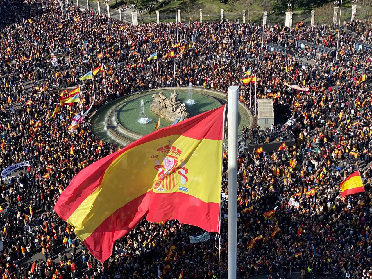 Un total de 31.000 manifestantes, según cifras de Delegación del Gobierno en Madrid, han ocupado la plaza y las calles adyacentes portando sobre todo banderas de España o pancartas con mensajes como «Sánchez, traidor», «Gobierno, dimisión», «Separatistas, fuera de aquí» o «Democracia, sí, Dictadura, no».