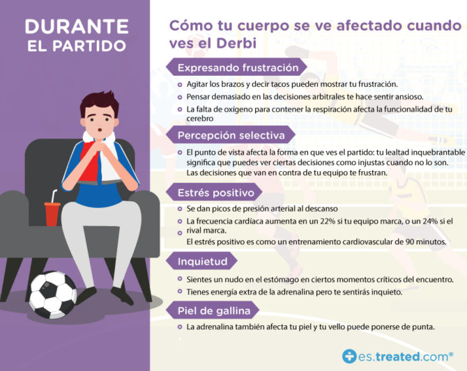 El Derbi es un partido que cualquier aficionado marca en el calendario y espera con ansias ya que quieres tener el derecho de alardear sobre tu rival más cercano. A medida que se acerca el inicio, los aficionados pueden comenzar a sentir ansiedad por el resultado, a veces denominado como «estrés previo al partido». Esto puede manifestarse como «mariposas en el estómago», sensación de malestar o náuseas. Esta sensación de malestar puede durar un minuto o continuar durante una hora y media, lo que puede ser inquietante.
