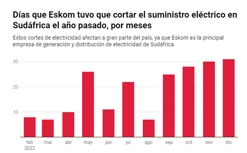 Aunque uno de los países más ricos del continente enfrenta problemas de energía desde 2007, el año pasado los apagones se duplicaron y, en lo que va de 2023, han alcanzado un nivel sin precedentes. Diariamente, la energía se va durante 10 o 12 horas en varias regiones de Sudáfrica.