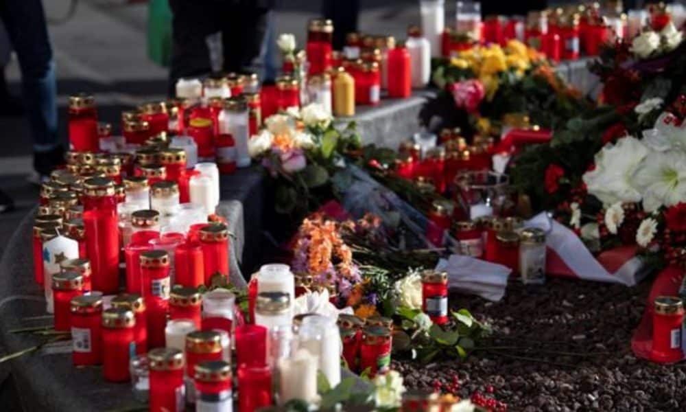 Velas y ramos de flores van conformando un improvisado altar en el mercado de Navidad de la plaza Königsplatz de Augsburgo, en memoria del bombero de...