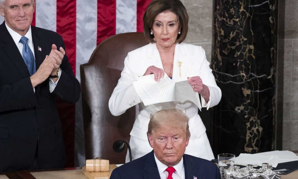 Con un gesto de desdén, la presidenta de la Cámara Baja de EE.UU., la demócrata Nancy Pelosi, rompía este martes su copia del discurso que acababa...