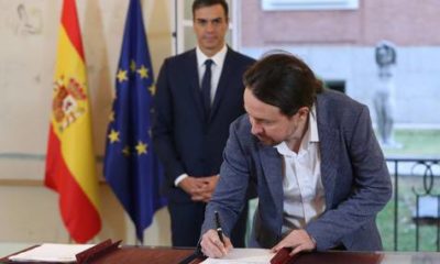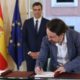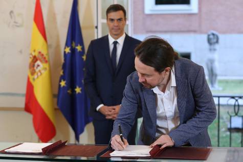 El presidente del Gobierno, Pedro Sánchez, y el secretario general de Podemos, Pablo Iglesias, han firmado hoy en el Palacio de la Moncloa el acuerdo sobre...