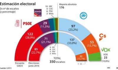 Mientras el centro-derecha se desinfla, arrastrado sobre todo por una caída sostenida de Ciudadanos, y se quedaría ahora con 161 diputados, el PSOE mantiene su tendencia...