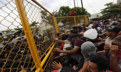 Miles de inmigrantes, en su mayoría hondureños, rompieron la valla metálica que separa a Guatemala de México y después de un enfrentamiento con la policía, cruzaron...