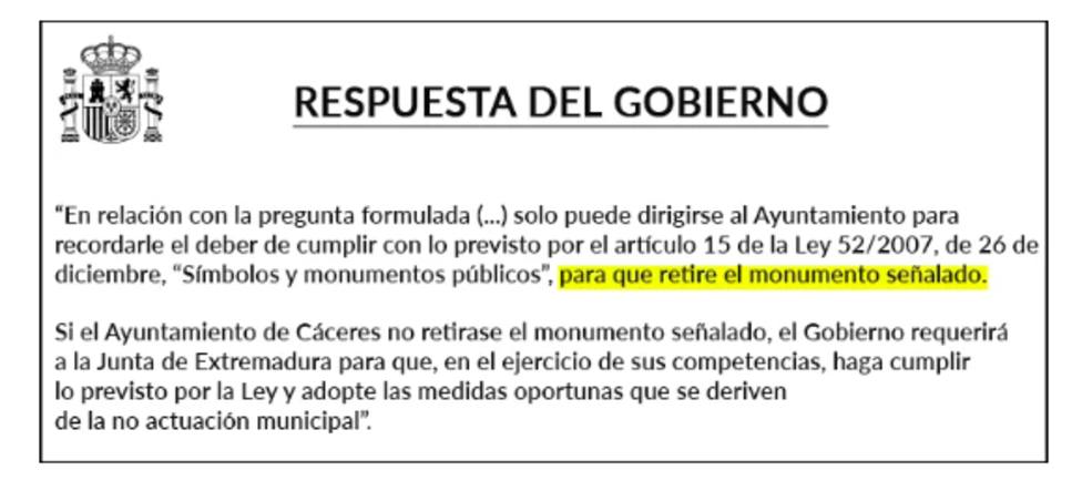 Una petición que a juicio de la Asociación de Abogados Cristianos se realiza por el odio que estos partidos profesan hacia la libertad religiosa. Tras aquella demanda del diputado de Compromís, el Ejecutivo Central le dio la razón y pidió al parlamentario que instara al Ayuntamiento a cumplir con lo previsto en la Ley de Memoria Históricapara que procediese al retiro del monumento y, en caso de no hacerlo, que recurriera a la Junta de Extremadura para que, en el ejercicio de sus competencias, hiciera cumplir al Consistorio cacereño la normativa.