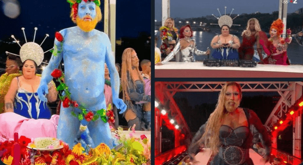 Durante la ceremonia de apertura del viernes, varios actos destacaron la historia y la cultura de Francia, pero un segmento notable contó con unos 18 artistas posando detrás de una mesa larga con el río Sena y la Torre Eiffel de fondo, haciendo una parodia con temática drag queen de «La Última Cena» de Leonardo da Vinci, en la que aparecen Jesús y sus apóstoles, pero todos estaban con poca ropa y emulando actos sexuales.