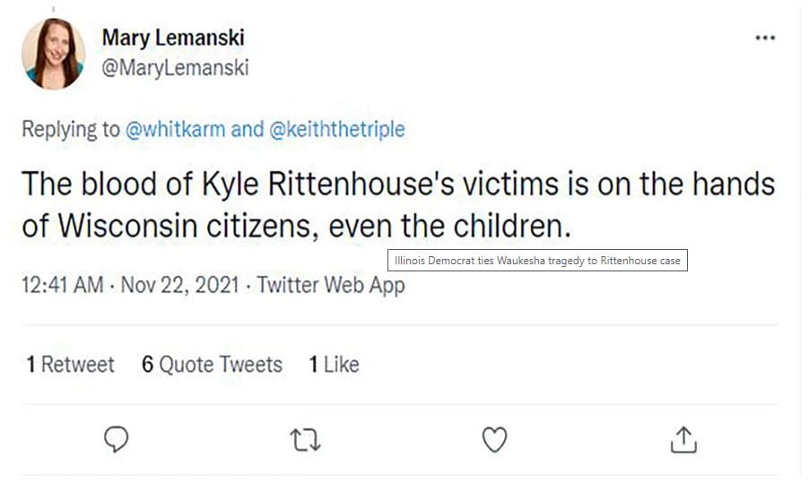 Poco después de conocerse que un criminal había irrumpido con su coche en un desfile de Navidad en un pueblo de Winsconsin, Waukesha, abriéndose paso durante varios minutos causando cinco muertos y cuarenta heridos, Mary Lemanski, directora de Medios del Partido Demócrata en el Condado de DuPage, Illinois, sugirió en redes sociales que la horrible matanza era la venganza del destino por el veredicto de inocencia en el caso de Kyle Rittenhouse, y bromeó añadiendo que “probablemente haya sido en defensa propia».